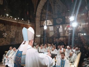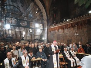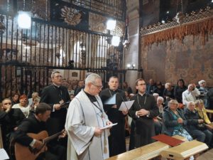 O godz. 23:00 zebraliśmy się na Mszy Świętej, której przewodniczył biskup pomocniczy archidiecezji poznańskiej Szymon Sułkowski, nominowany przez Papieża Franciszka Biskupem Diecezji Płockiej. Podczas wspólnej Eucharystii, nasze myśli i modlitwy skupione były wobec wszystkich Polaków w kraju i na świecie.
